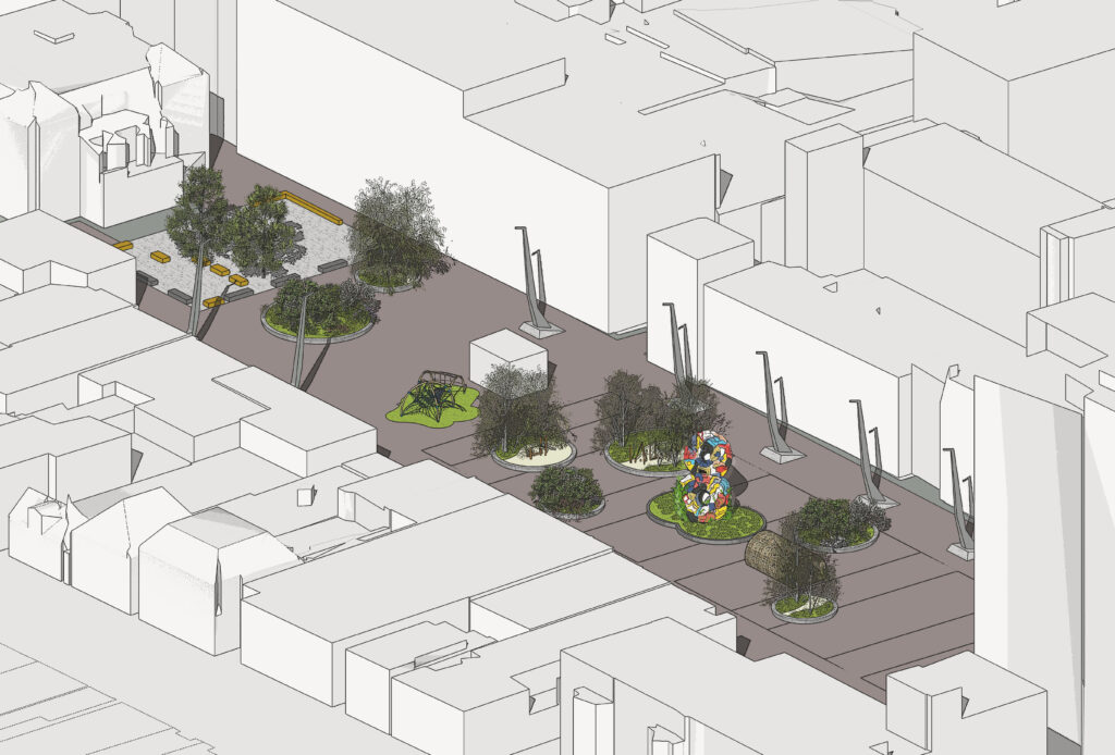 De ingeleverde bestrating wordt onderdeel van het kunstwerk. Het perk wordt aangelegd door de makers van het dada-monument; Marten Winters en Daan Soer. Dit doen ze samen met scholieren uit Drachten. Het perk krijgt eveneens de vorm van een acht. Ook Gemeente Smallingerland plaatst bakken op het Raadhuisplein voor beplanting en speeltoestellen. Met de komst van het groen, wordt het centrum van Drachten aantrekkelijker voor bezoekers, ondernemers, bewoners en andere gebruikers.